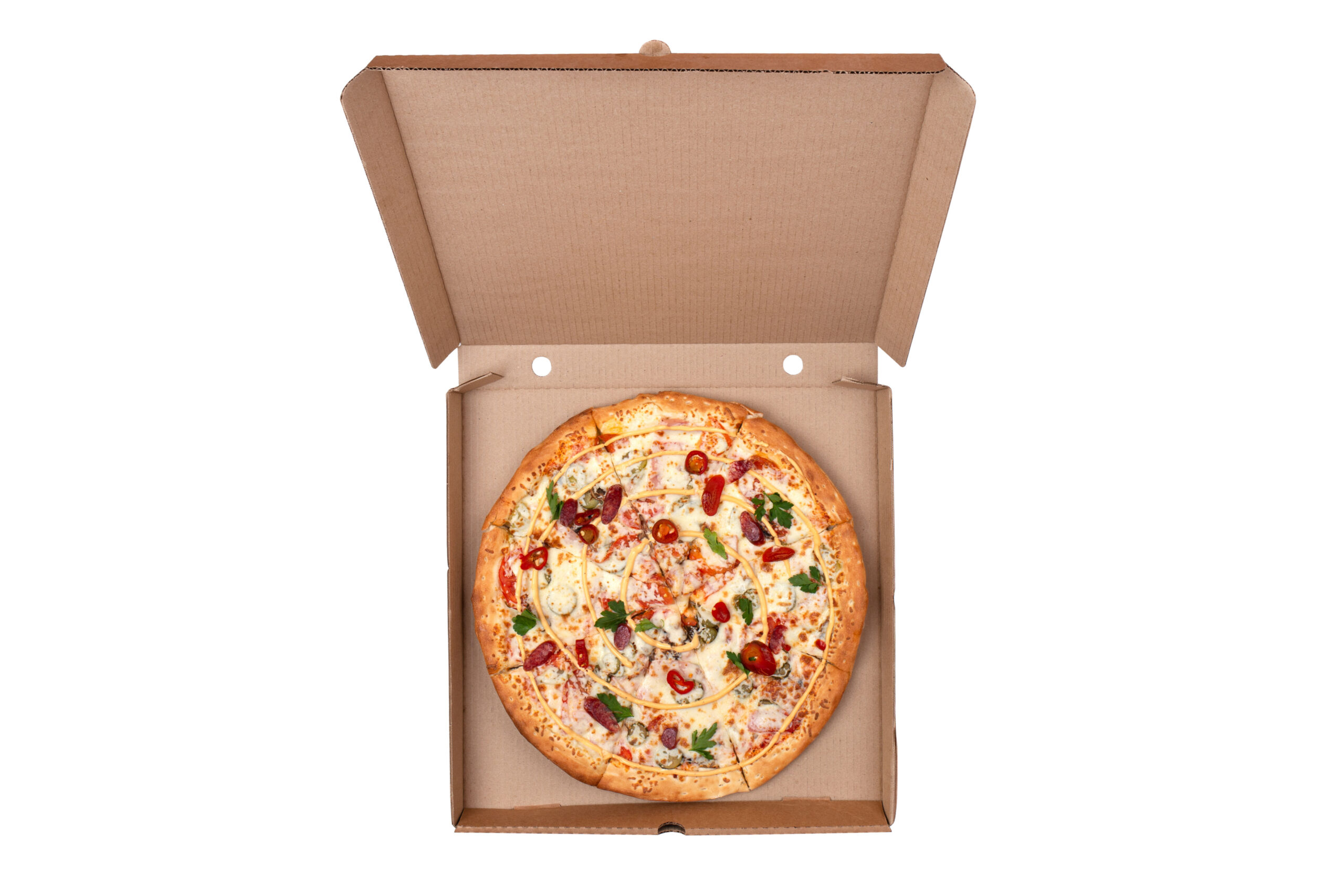 Compostable paper board pizza boxes without the plastic gloss Available in plain or print, or ask us about a custom print branded with your store logo.
