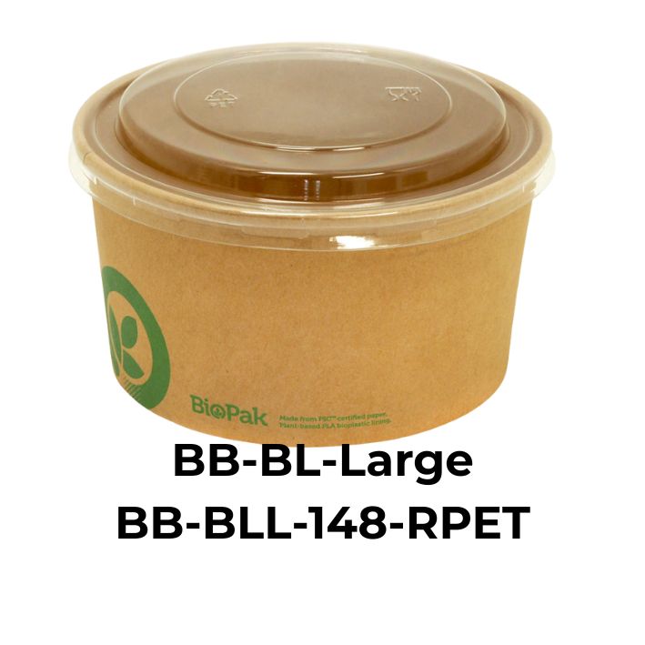 Kraft-look paper bio-bowls with an aqueous lining are leakproof and can be used for either hot or cold food. The bowls are available in 4 sizes, with the small, medium and large all fitting the same lid options. The largest size is BB-BL-EXTRA-LARGE with it’s own set of lid options. For more information regarding product specification, use the link below.